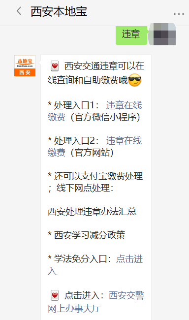 温馨提示:微信搜索公众号西安本地宝,关注后在对话框回复【违章】获取在线缴费入口,查看西安减分政策等信息,点击进入交警网上办事大厅。